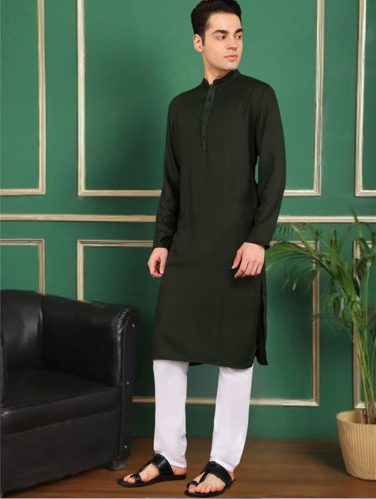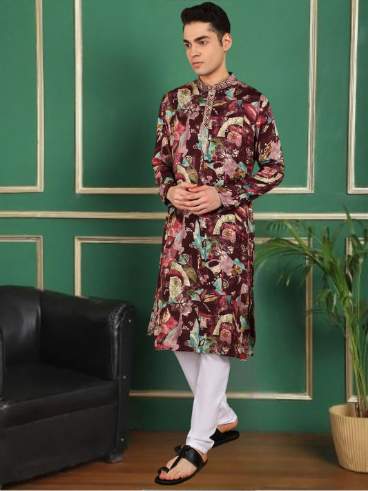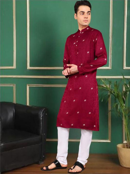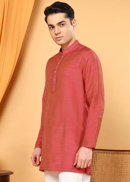 Tattva Men Fuchsia Colored Embroidered Short Kurta