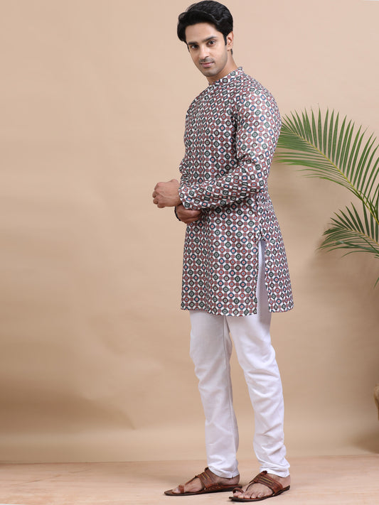 Tattva Geometric Printed Mandarin Collar Cotton Straight Short Kurta