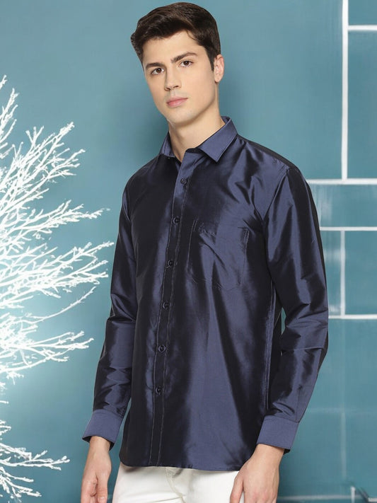 Navy Blue Color Art Silk Slim Fit Solid Party Shirt