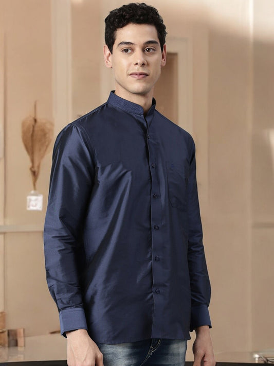 Navy Blue Color Art Silk Slim Fit Solid Party Shirt