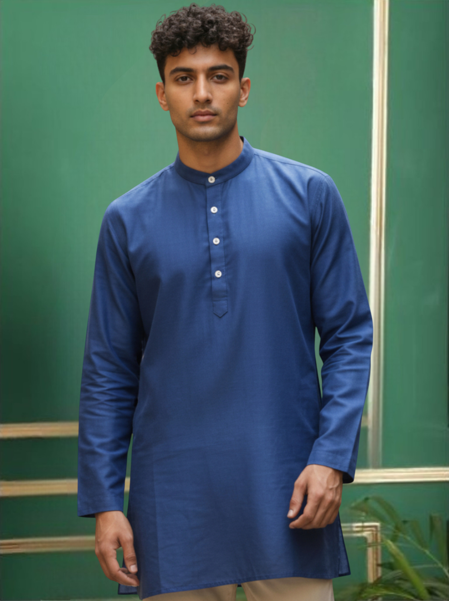 This Blue cotton solid straight kurta, has a mandarin collar, long sleeves, straight hem, wooden buttons, side pockets and side slits