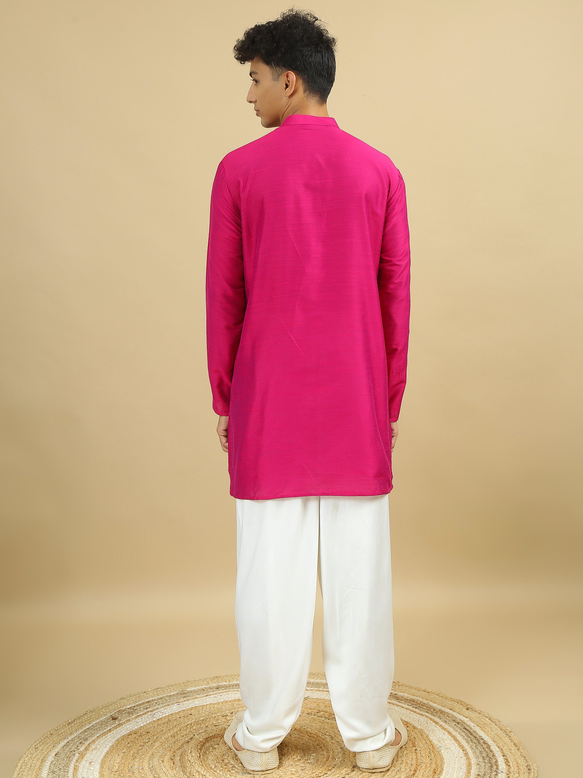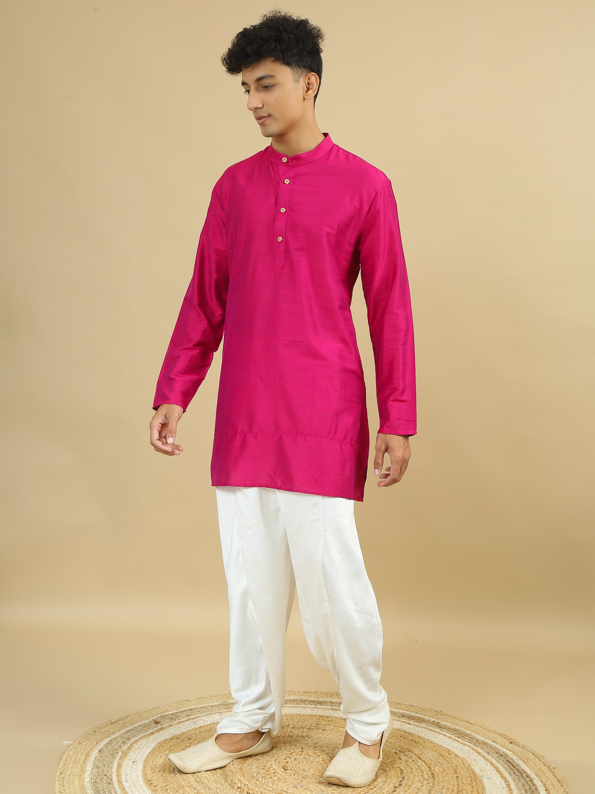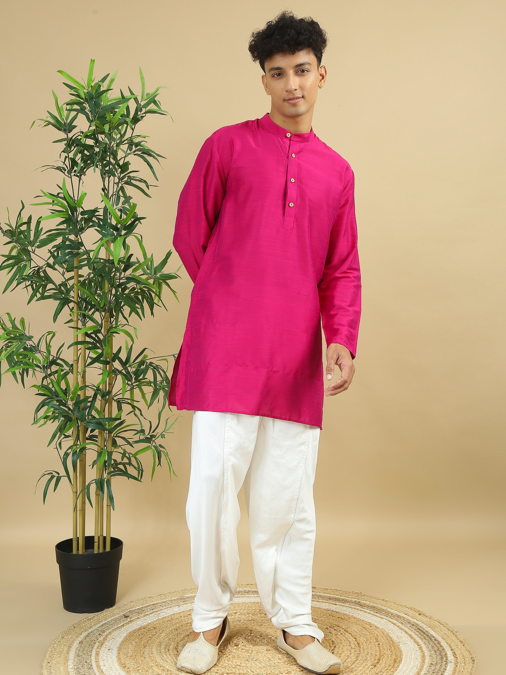 This Fuchsia cotton solid straight short kurta, has a mandarin collar, long sleeves, and straight hem, wooden buttons, side pockets and side slits