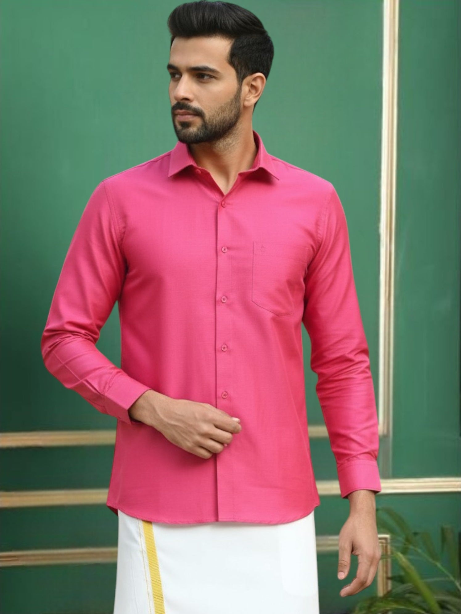 This Pink Polyester Regular Fit Solid Party Shirt with Mandarin Collar has Long, roll-up sleeves