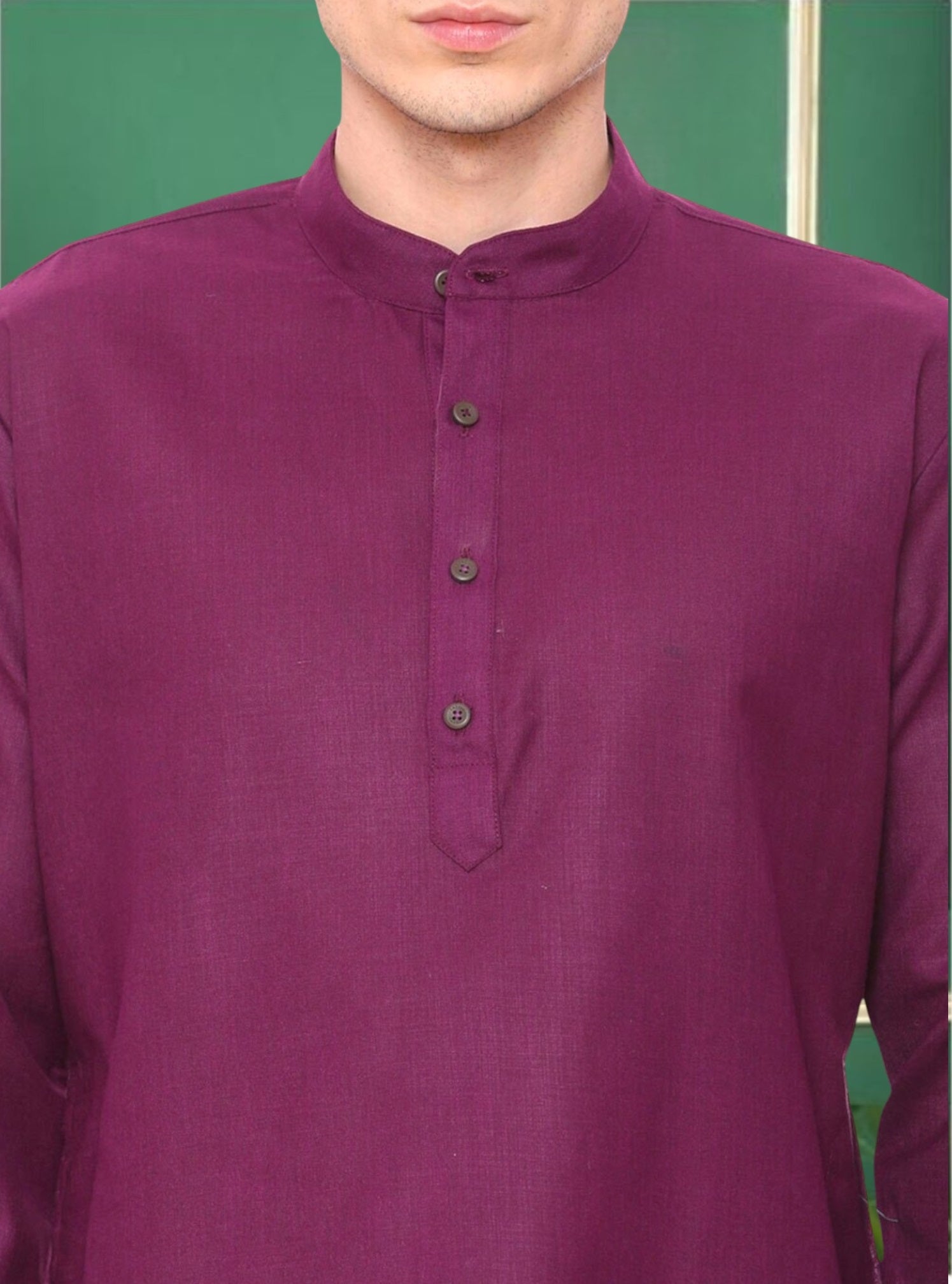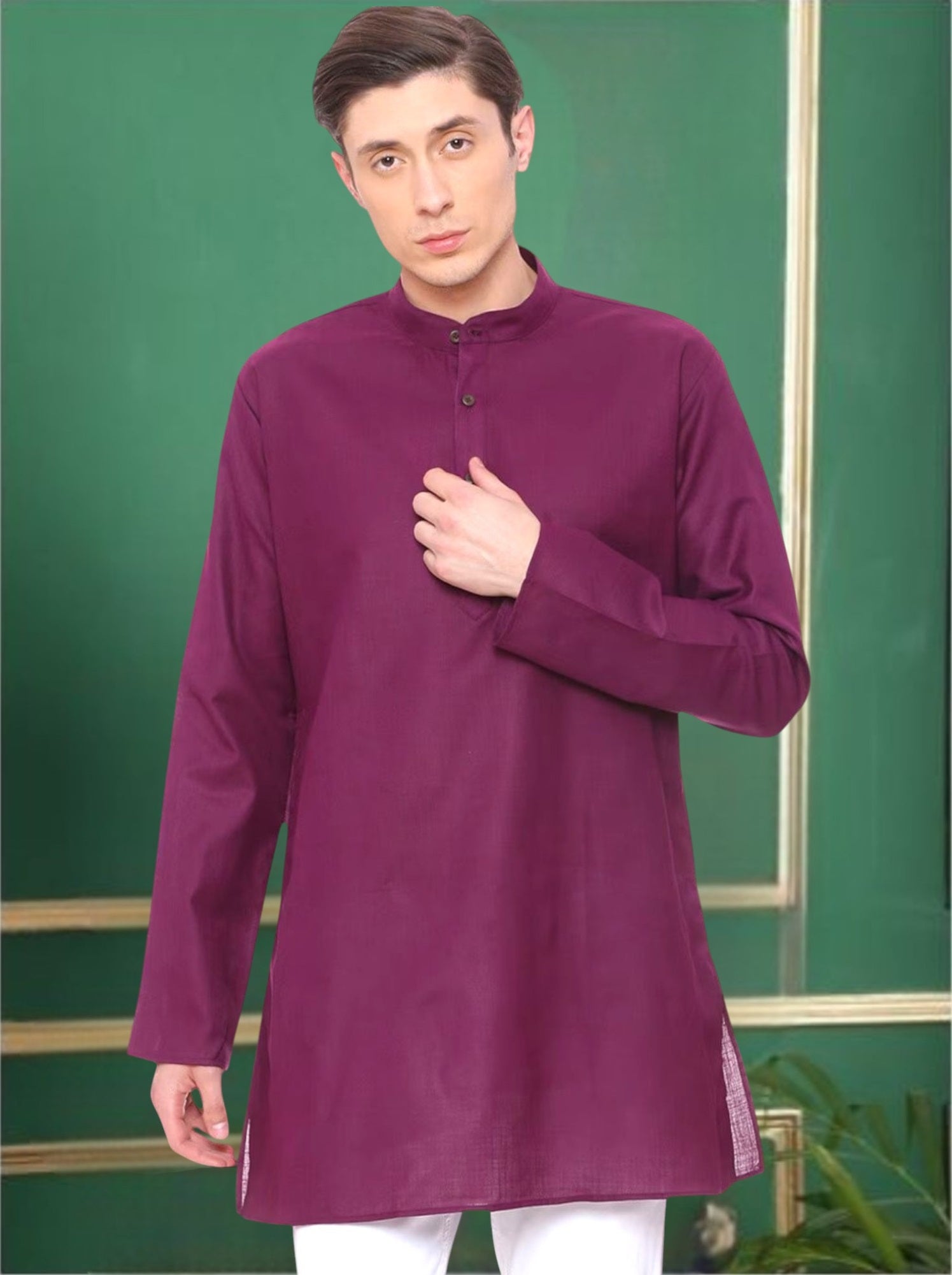 Description: Purple Cotton Solid Straight Short Kurta with Mandarin Collar, Full Sleeves, Straight Hem, Side Slits, Wooden Buttons and Side Pockets.