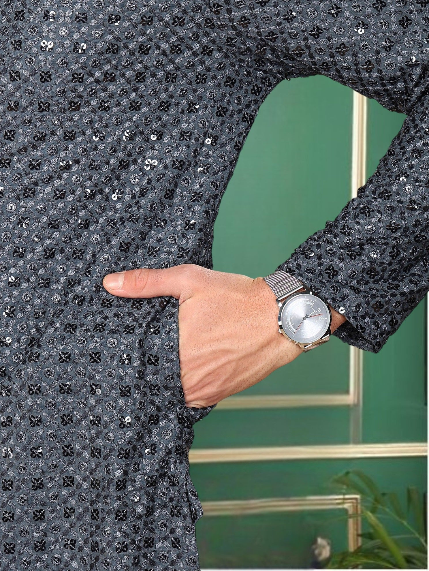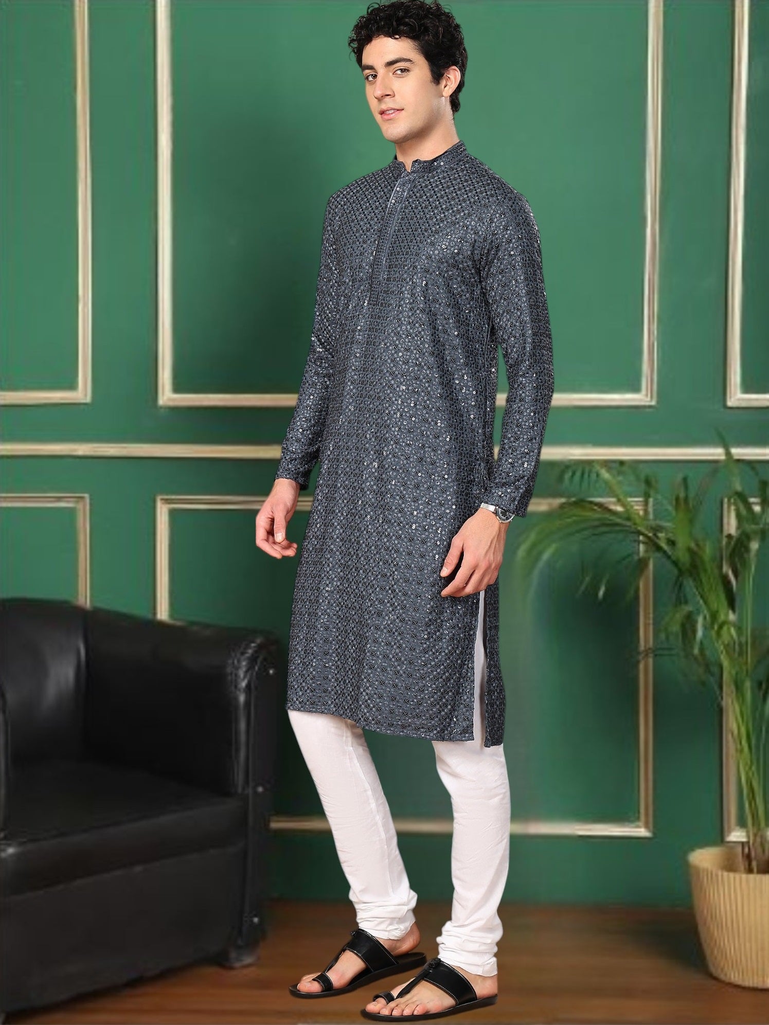 This Grey Toned Long Kurta has a Mandarin Collar, Long Sleeves, Straight Hem, Side Slits, and Side Pockets.