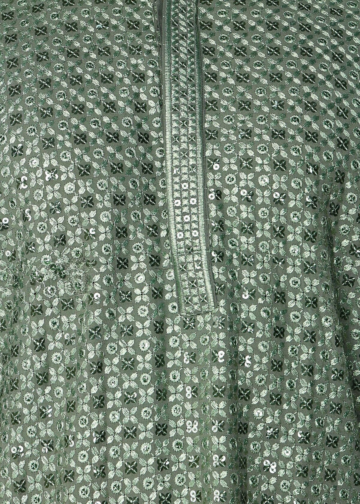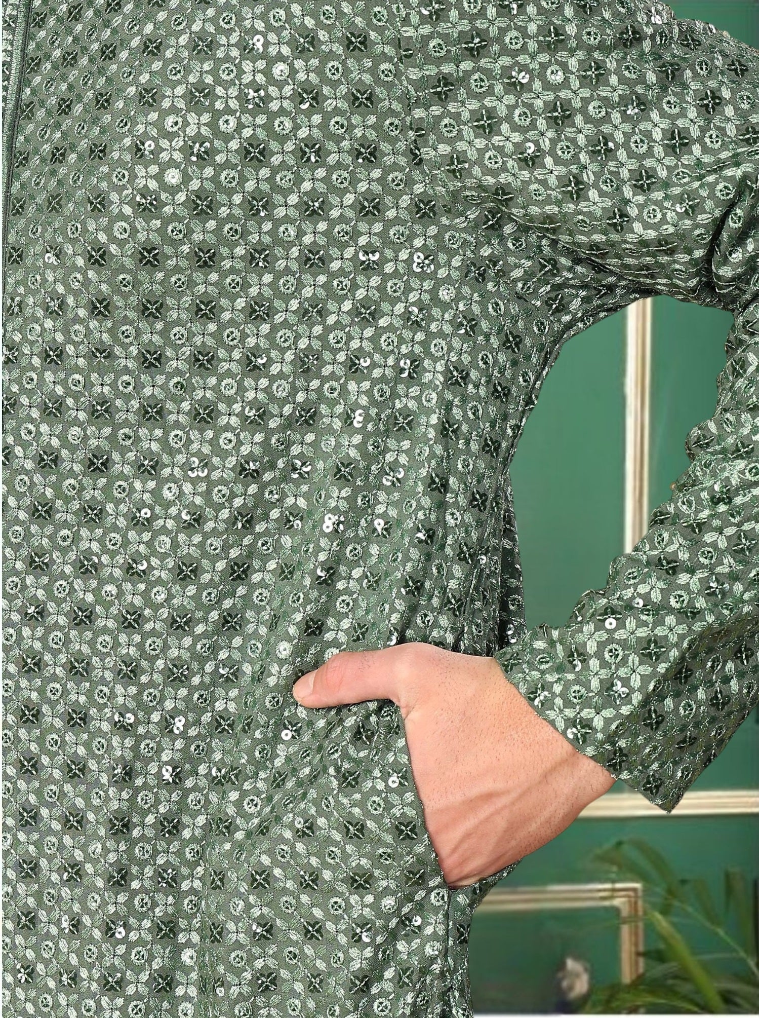This Green Toned Long Kurta has a Mandarin Collar, Long Sleeves, Straight Hem, Side Slits, and Side Pockets.