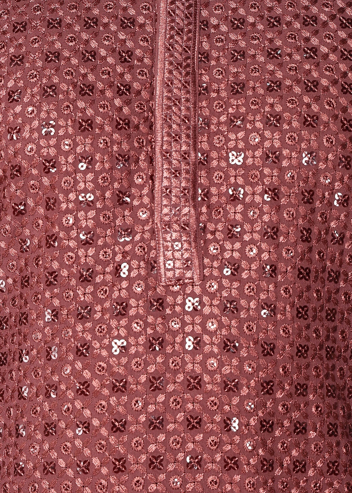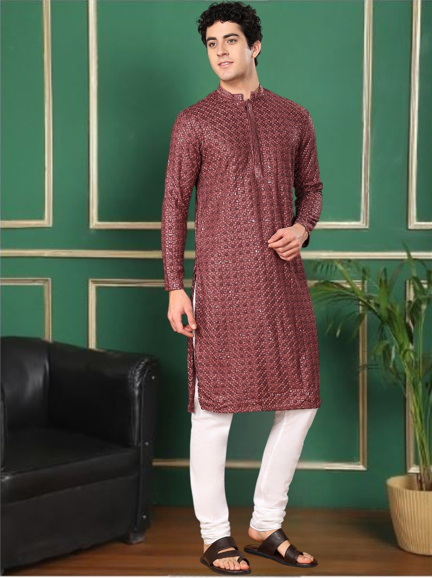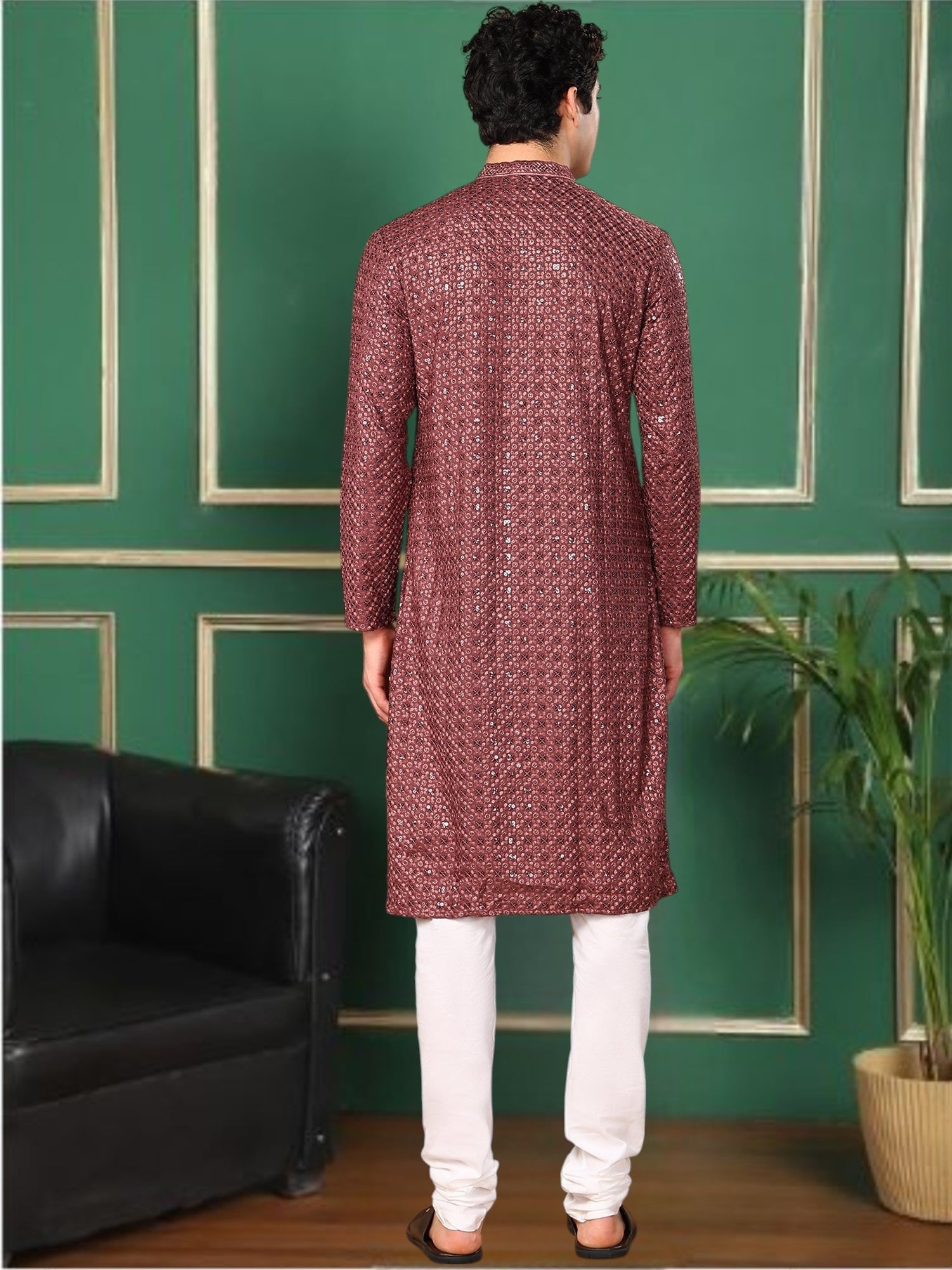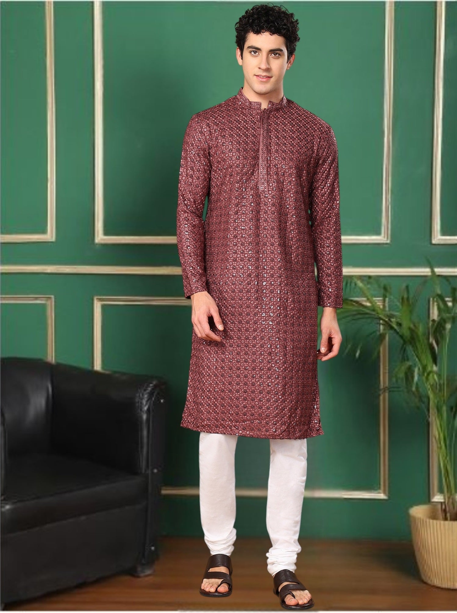 This Brown Toned Long Kurta has a Mandarin Collar, Long Sleeves, Straight Hem, Side Slits, and Side Pockets.