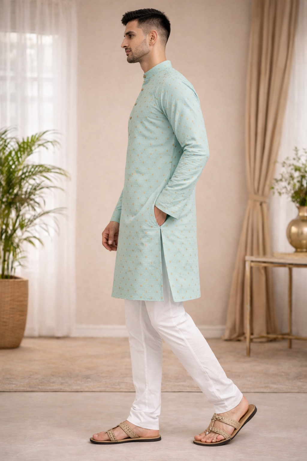 Redefine understated elegance with this printed short kurta, featuring a subtle all-over motif and a classic mandarin collar. Tailored for a clean, contemporary fit, it’s an ideal choice for festive gatherings, casual celebrations, and polished ethnic wear.