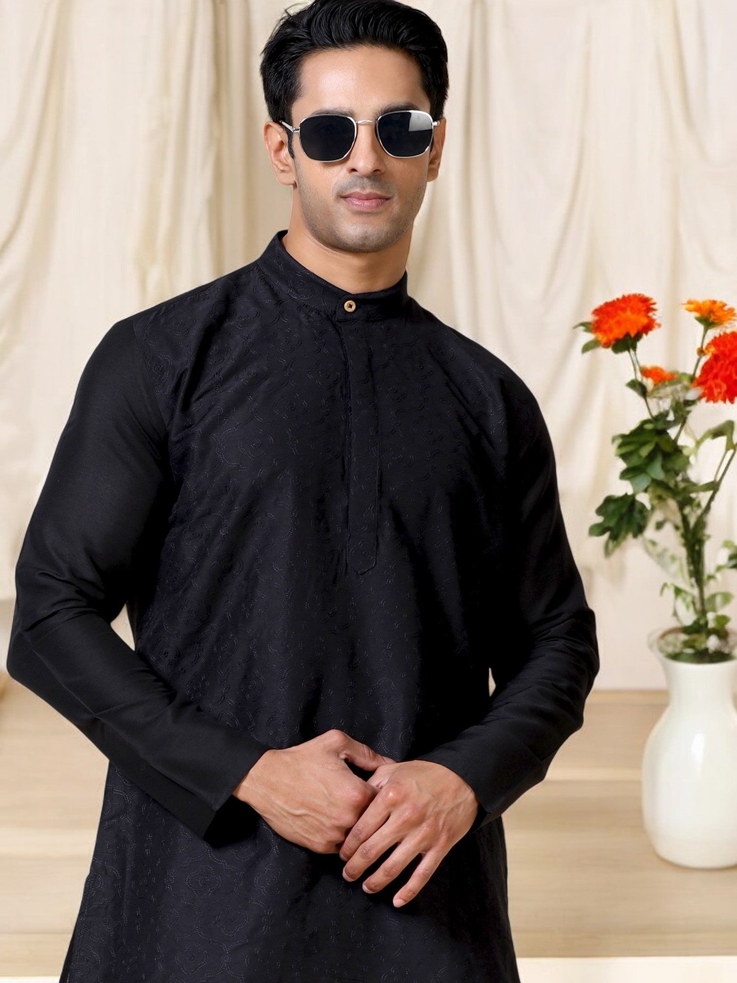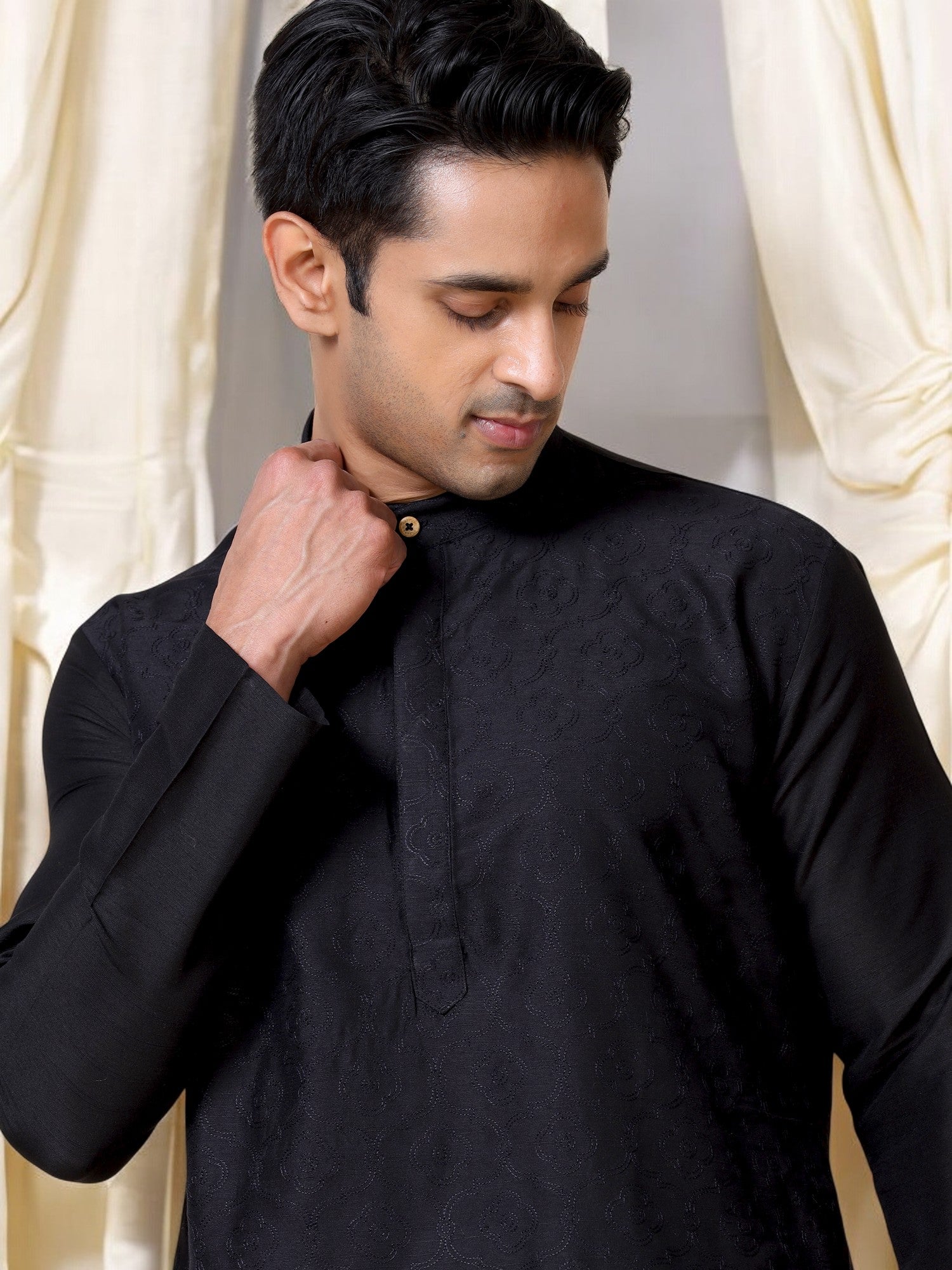 Tattva Men Embroidered Cotton Blend Straight Kurta Has a mandarin collar, Long sleeves, and straight hem, Side Slits, and Side Pockets. A must-have piece in your wardrobe