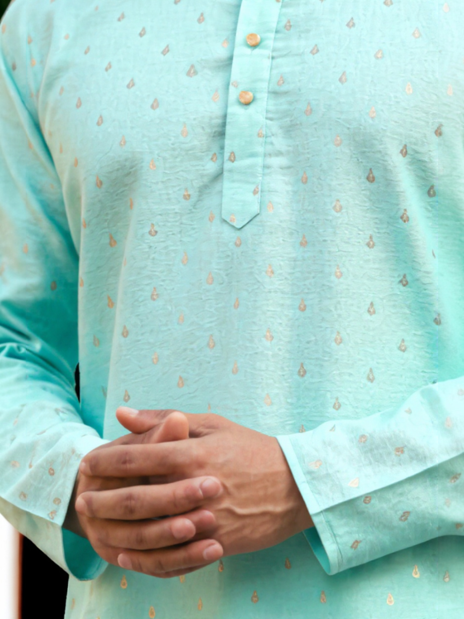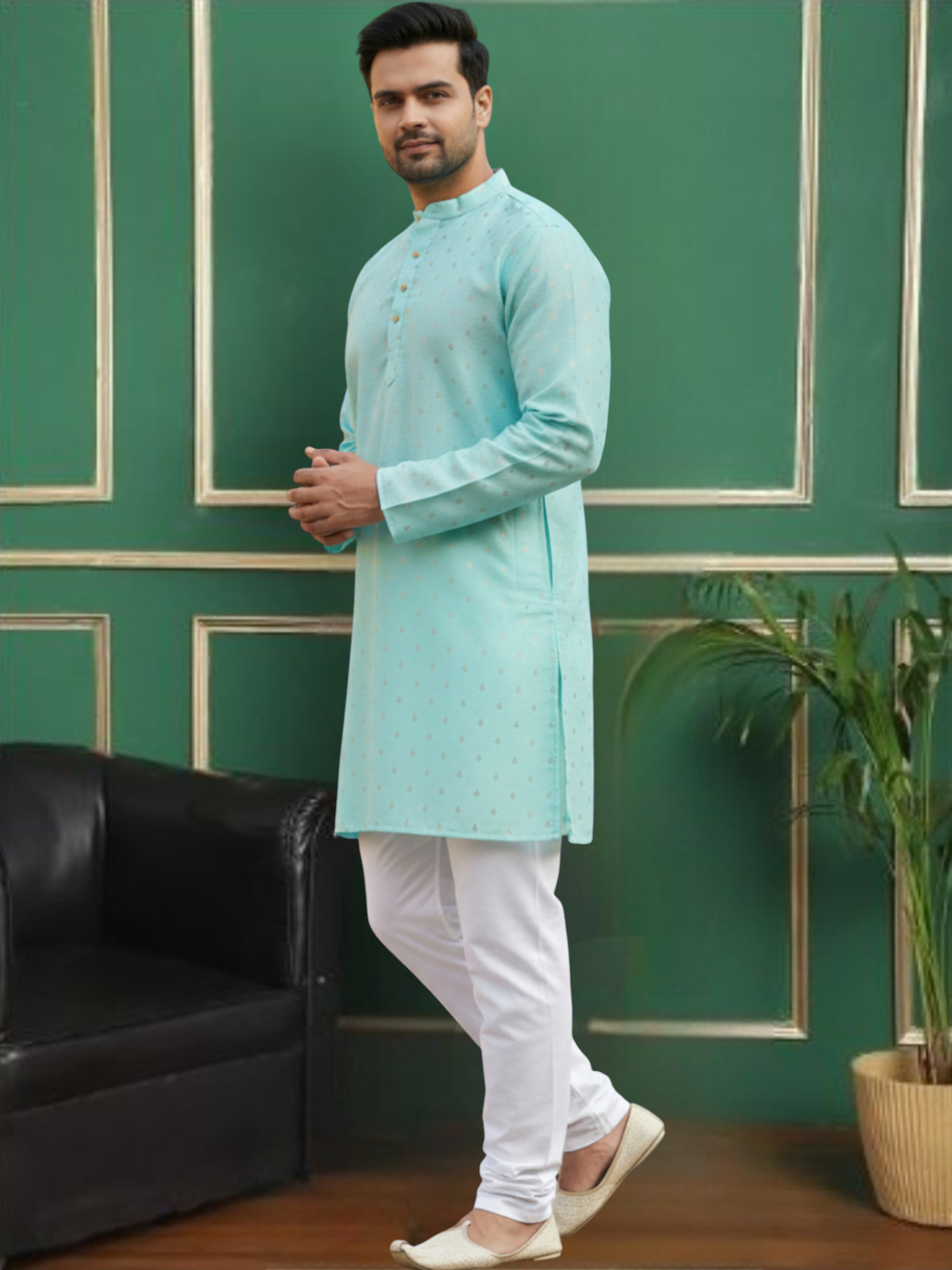 Introducing our Men's Slim Fit Turquoise Short Kurta a timeless wardrobe essential that effortlessly combines style and comfort. Crafted with care from premium Cotton Blend Material, this Kurta is designed to elevate your everyday look while keeping you at ease throughout the day.