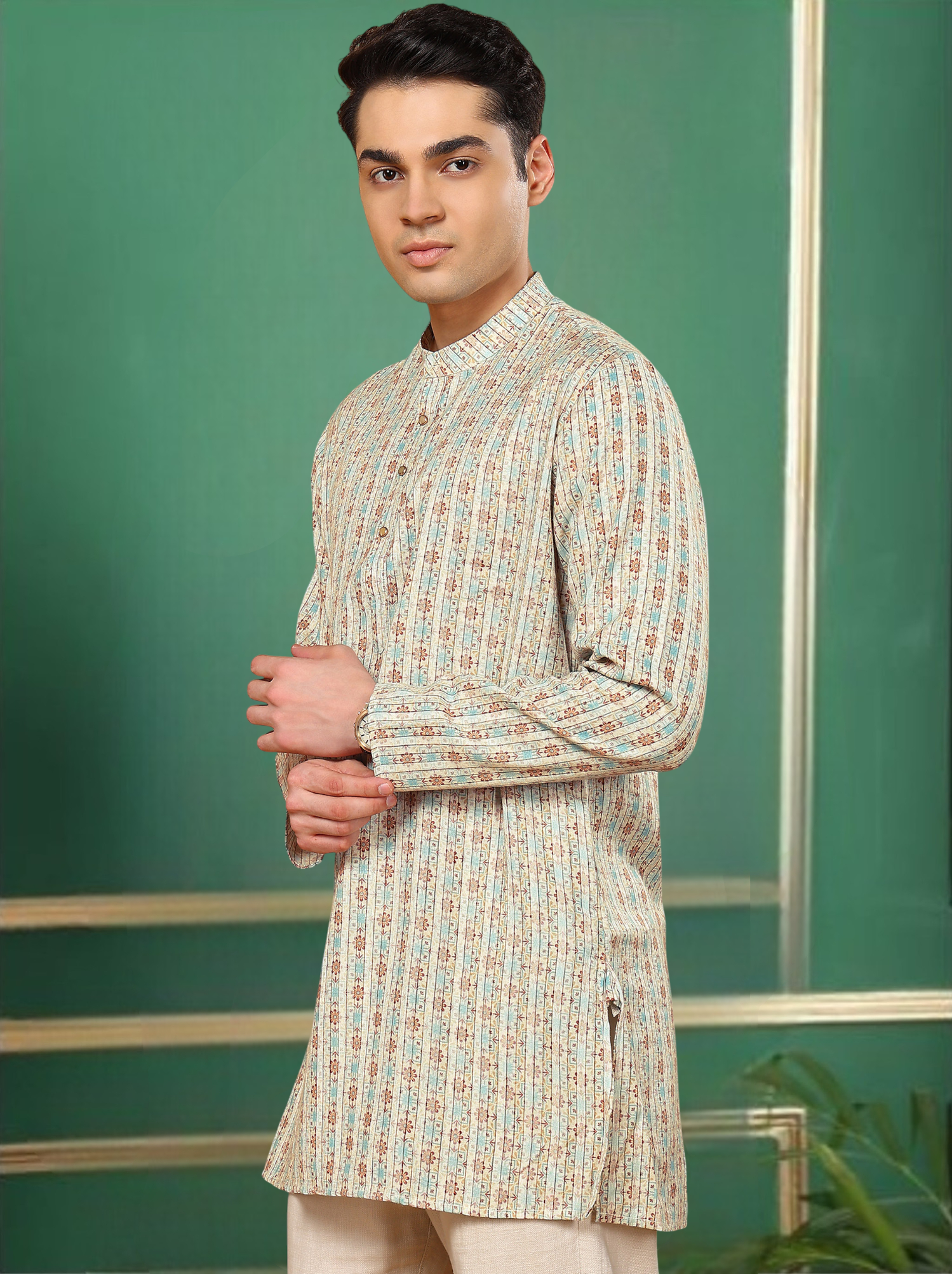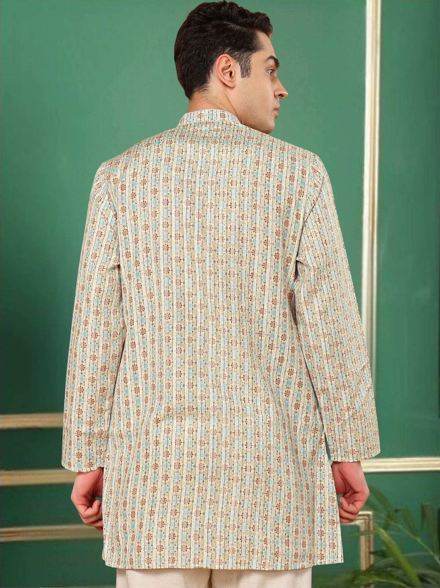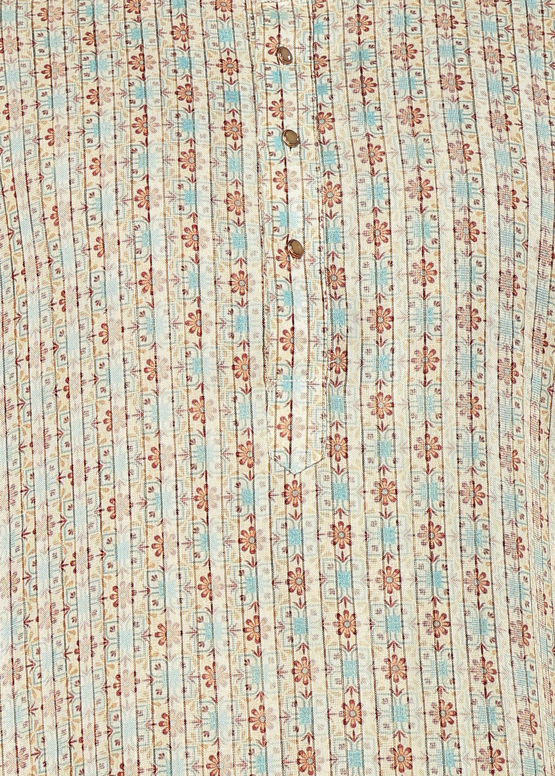 Beige toned Floral and Geometric men's kurta from Tattva. This piece comes in a mandarin collar, Long sleeves, and a curved hem. Pair it up with a pyjama/dhoti/jeans to flaunt your style.