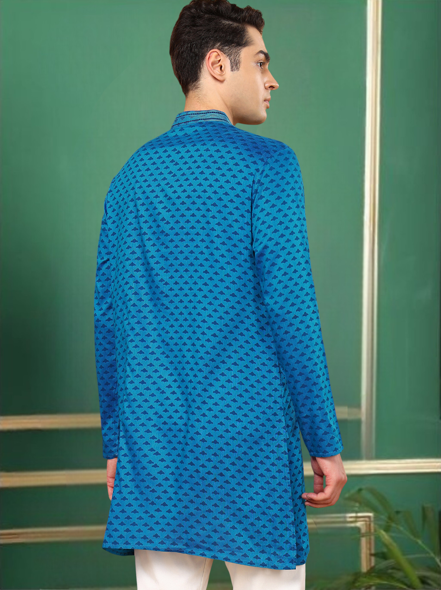 Blue toned Geometric printed men's kurta from Tattva. This piece comes in a mandarin collar, Long sleeves, and a curved hem. Pair it up with a pyjama/dhoti/jeans to flaunt your style