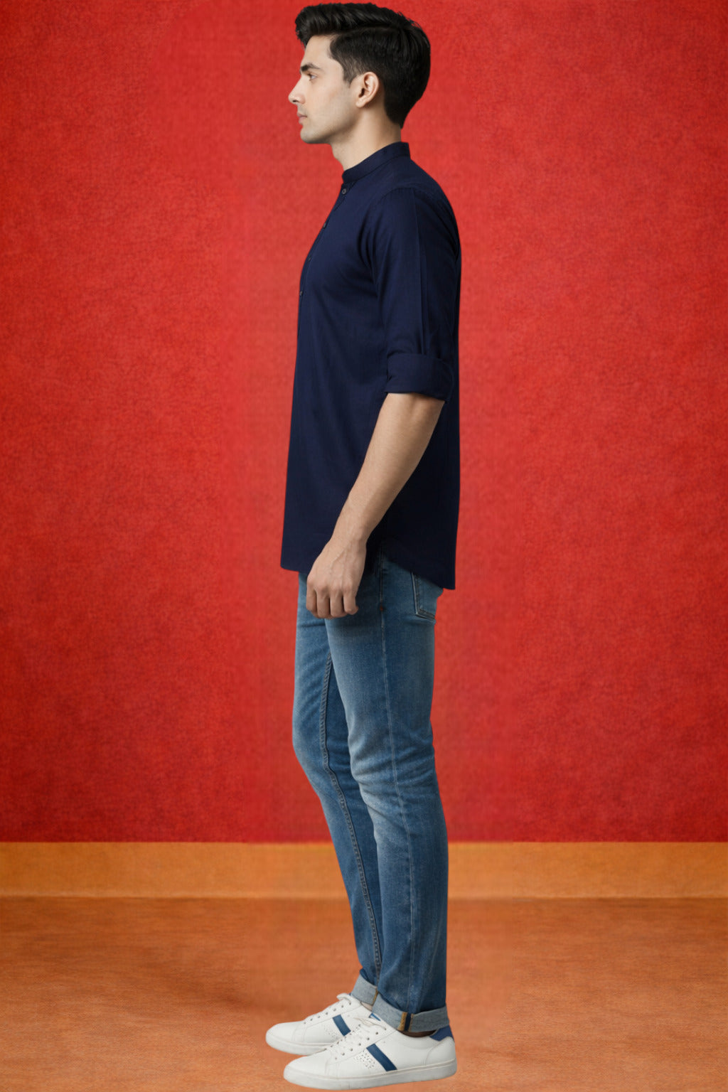 This printed T-shirt length kurta features a clean band collar and minimal ethnic motifs. Crafted in lightweight fabric, it offers everyday comfort with a contemporary fusion look.