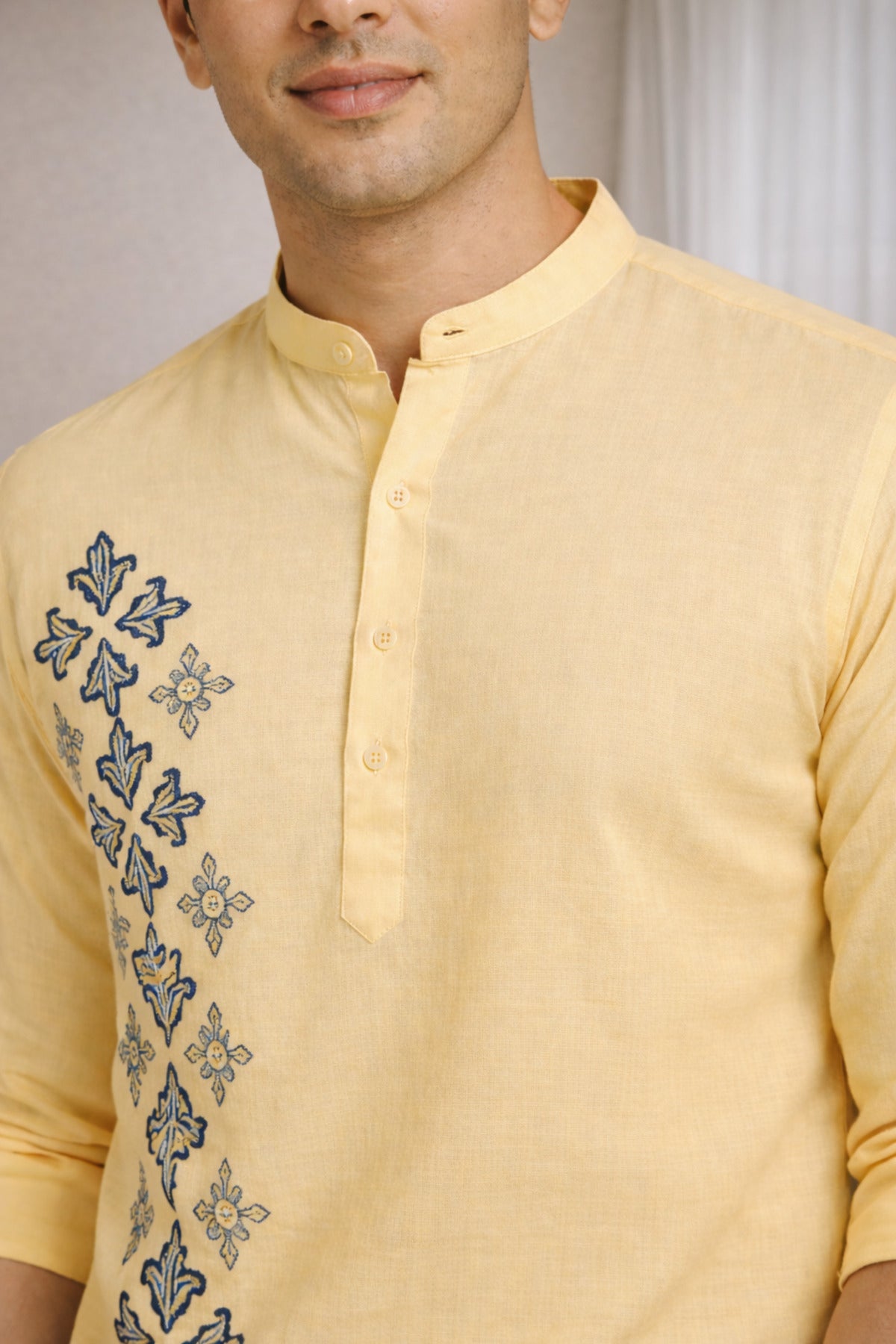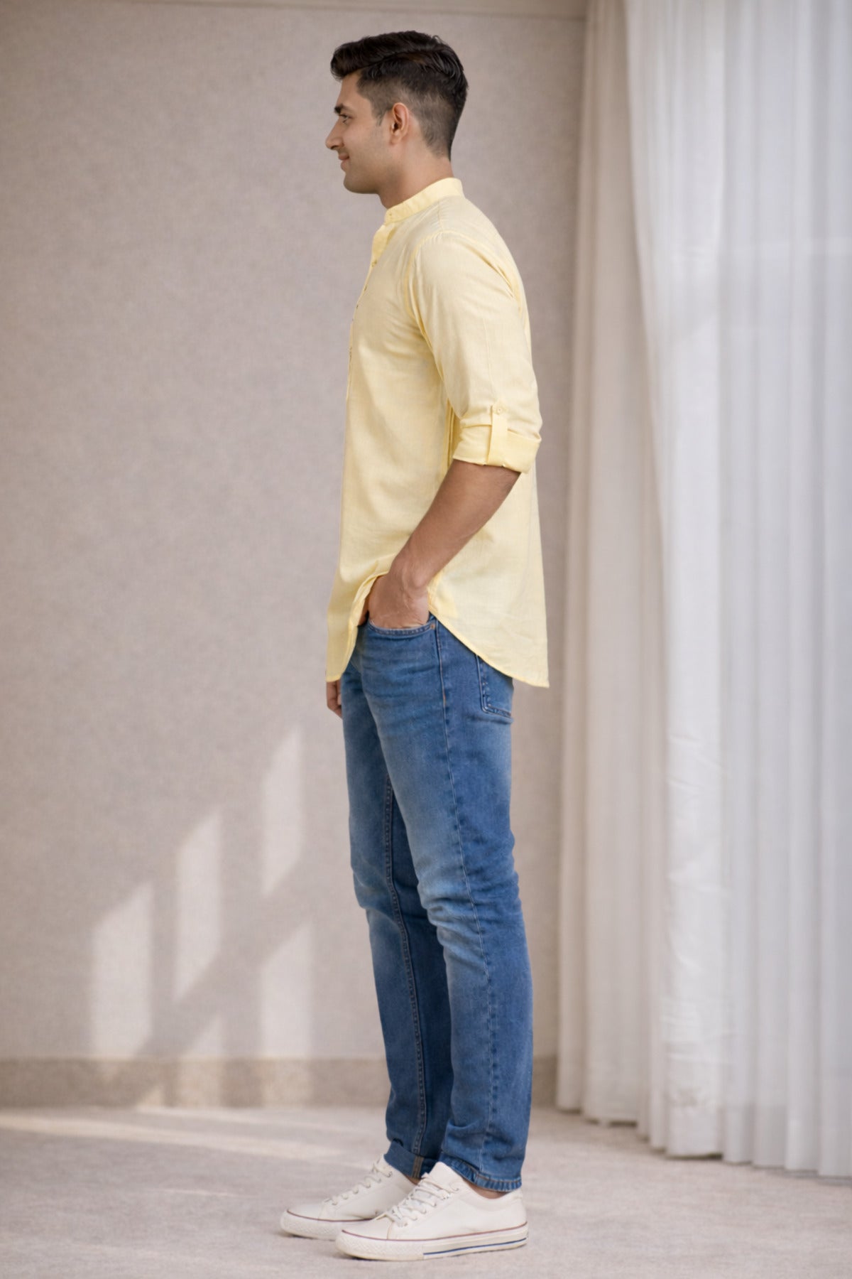 This printed T-shirt length kurta features a clean band collar and minimal ethnic motifs. Crafted in lightweight fabric, it offers everyday comfort with a contemporary fusion look.