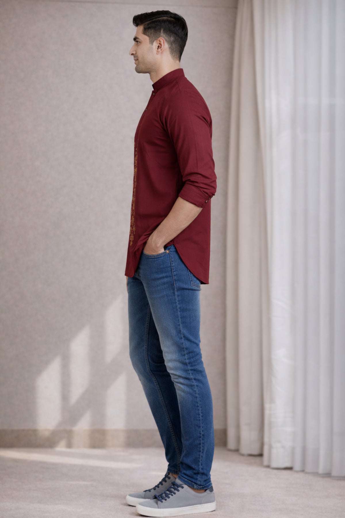 This printed T-shirt length kurta features a clean band collar and minimal ethnic motifs. Crafted in lightweight fabric, it offers everyday comfort with a contemporary fusion look.