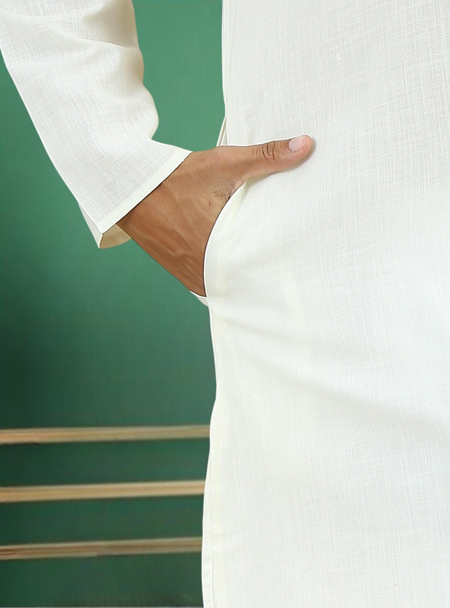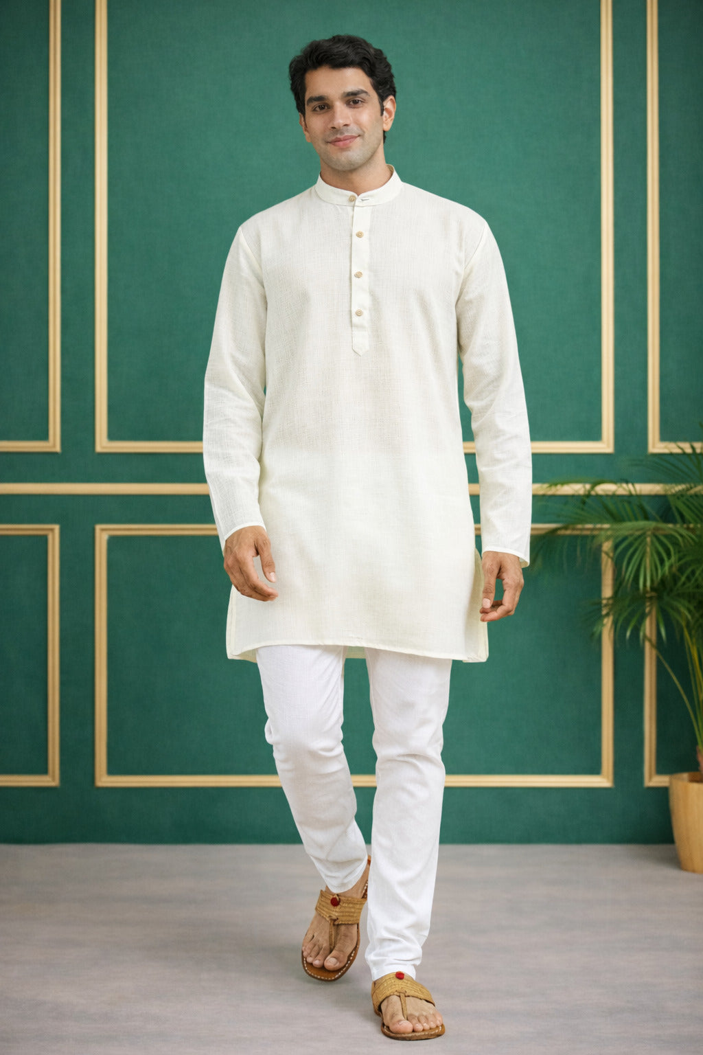 This solid cotton short kurta features a classic band collar and buttoned placket. Crafted from breathable fabric, it offers a clean, timeless look for everyday and festive wear.