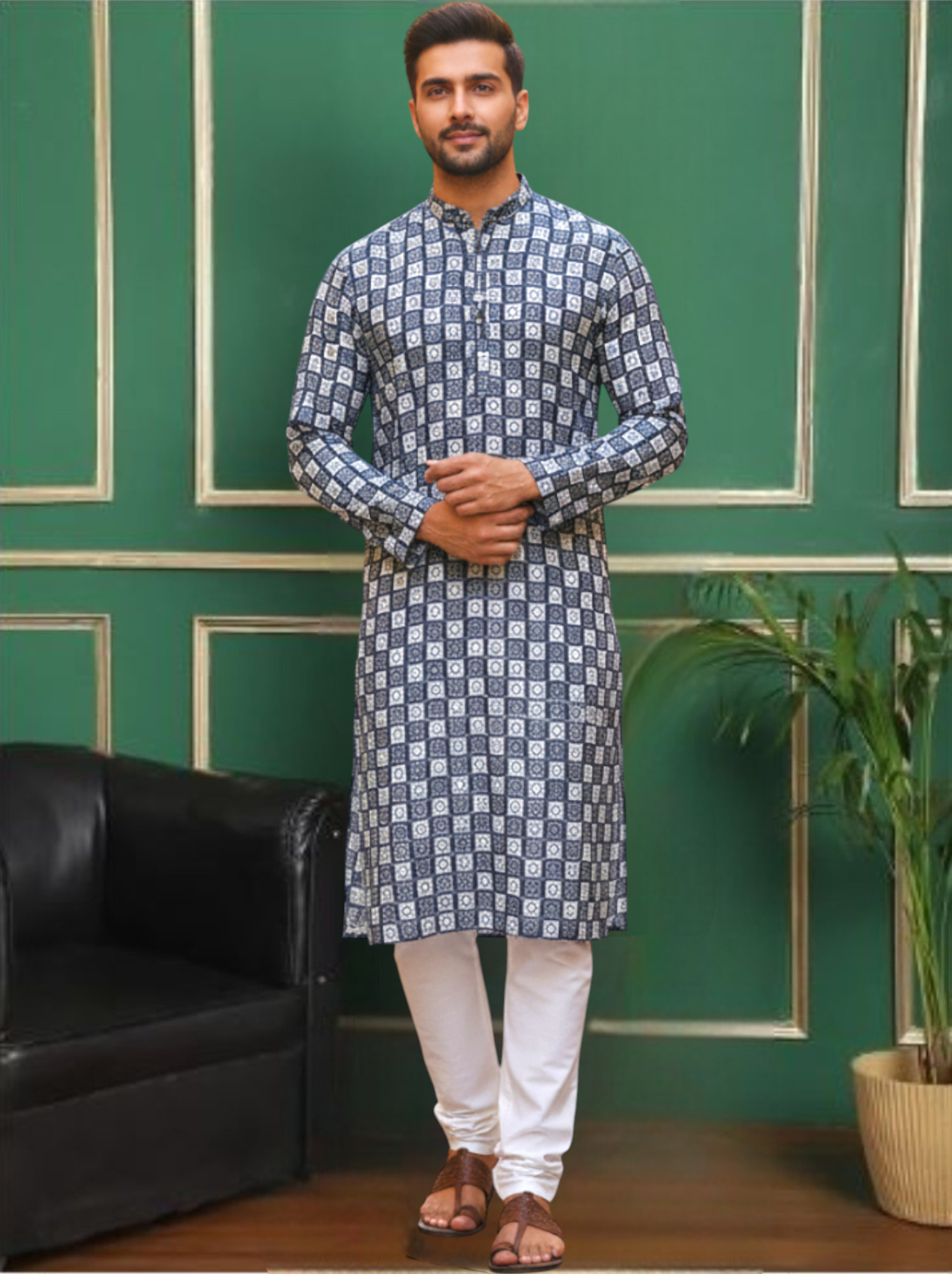 Tattva Men's Multi Colored Unique Men's Embroidered Threadwork Long Kurta Pyjama Set features a mandarin collar, long sleeves, and a straight hem. The intricate embroidery adds a touch of elegance, making it perfect for any occasion. Pair it with a pyjama, dhoti, or jeans to showcase your stylish flair.