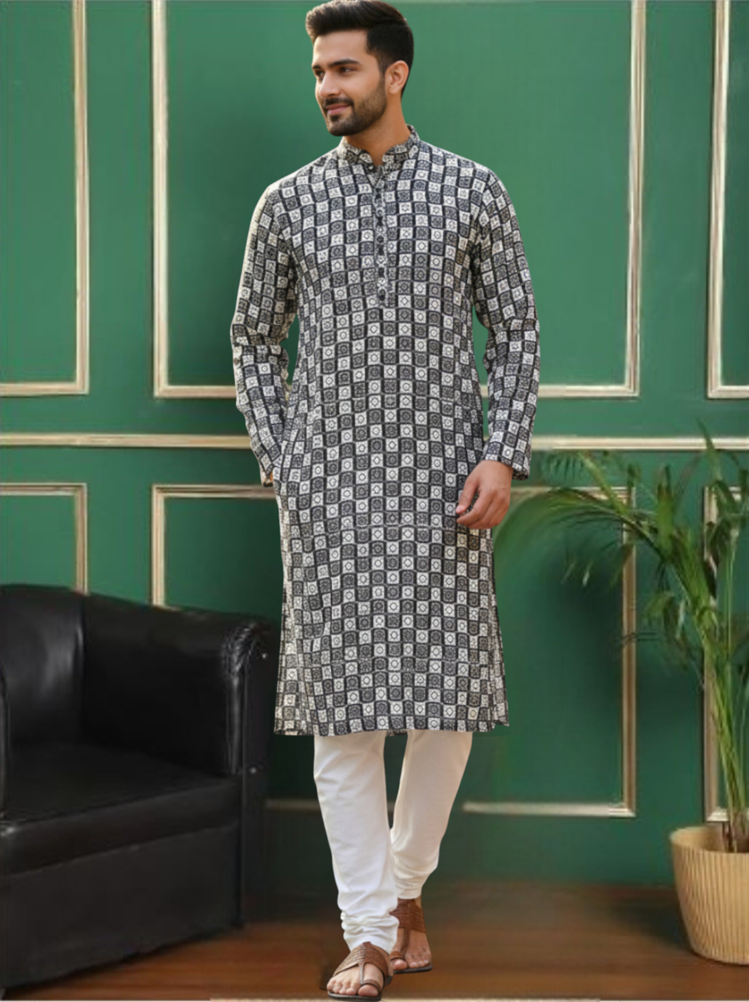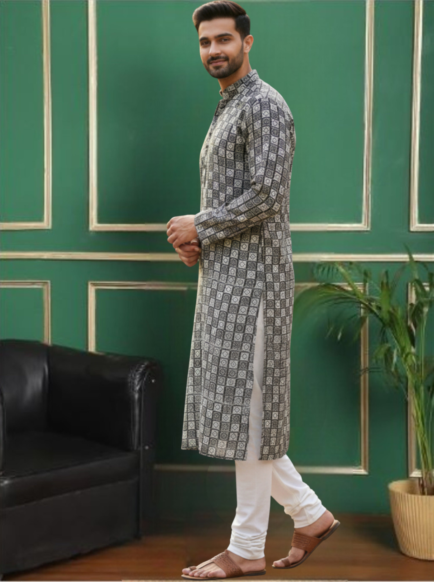 Tattva Men's Multi Colored Unique Men's Embroidered Threadwork Long Kurta Pyjama Set features a mandarin collar, long sleeves, and a straight hem. The intricate embroidery adds a touch of elegance, making it perfect for any occasion. Pair it with a pyjama, dhoti, or jeans to showcase your stylish flair.