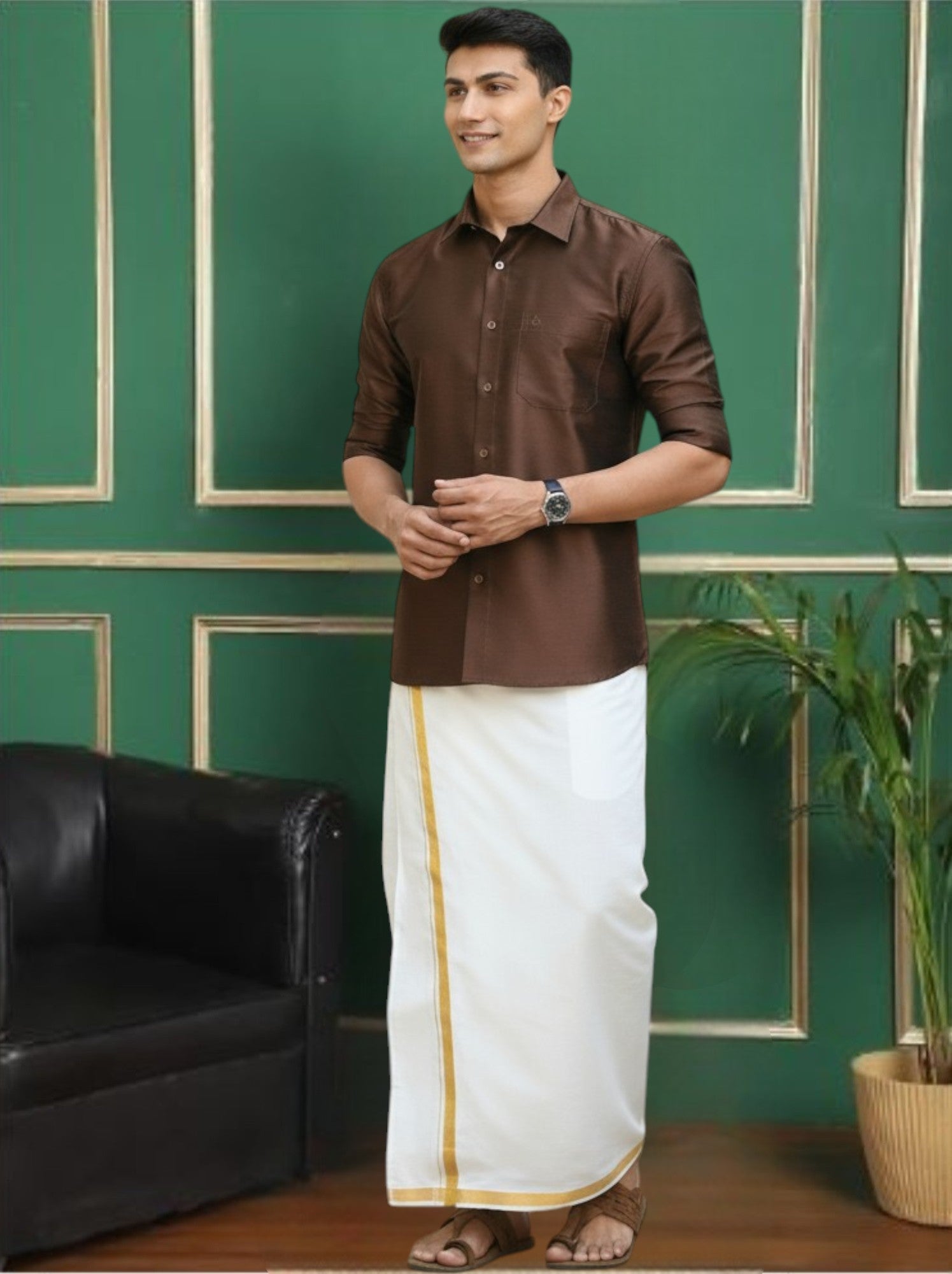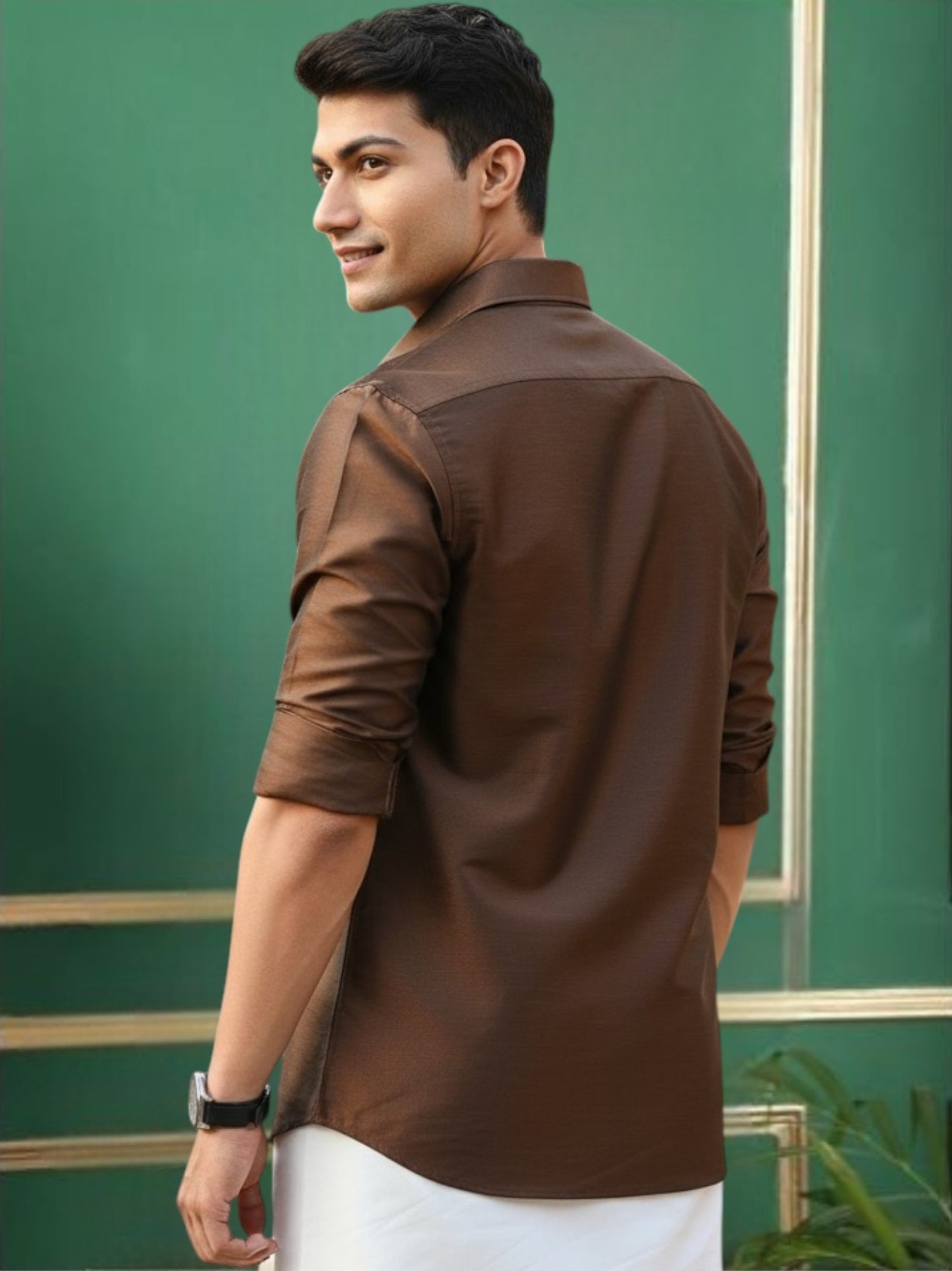 This Mens Brown Colour Solid Party Shirt comes with a spread collar and has Long roll-up sleeves